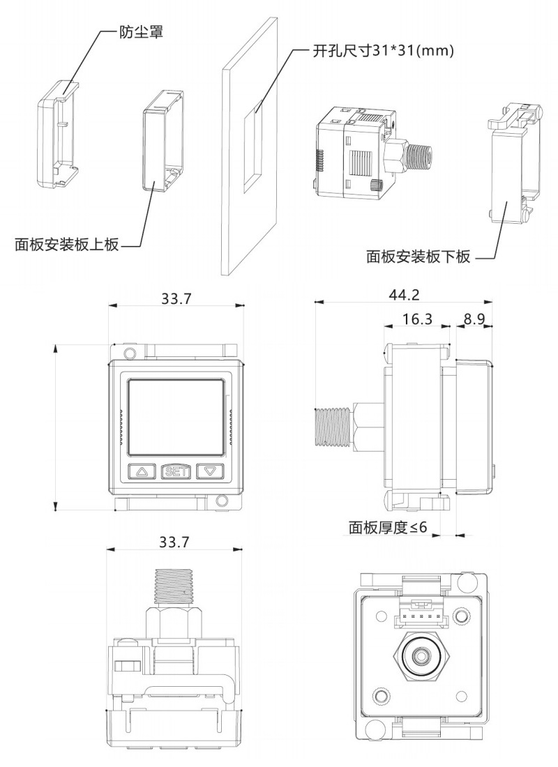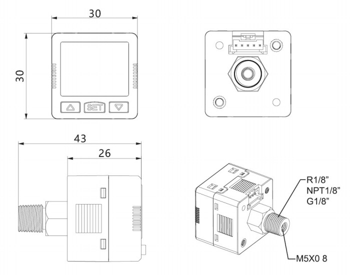 压力接口 | 外螺纹R1/8、NPT1/8、G1/8可选,内螺纹M5 | |||