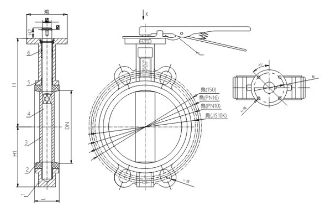 型号 | DN | A | B | L | H | H1 | H2 | K | E | N-ΦD | ISO | PN10 | PN16 | CL150 | JSI10K | |||||
